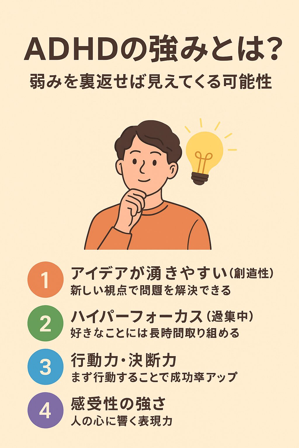 ADHDは「生きにくさ」と同時に、ユニークな強みを持っている特性 です。